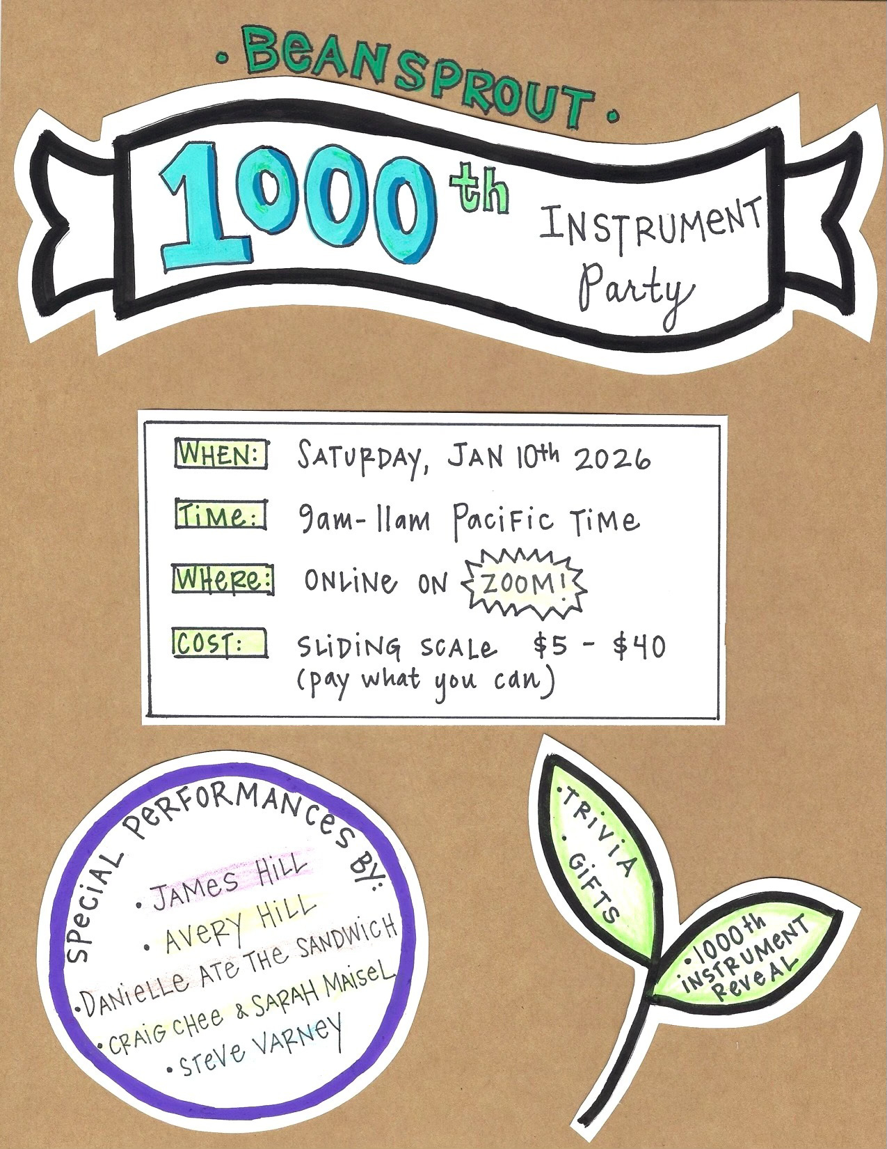 I will be unveiling my 1000th Beansprout Instrument next Saturday, January 10th on Zoom and you're all invited to the party!!!