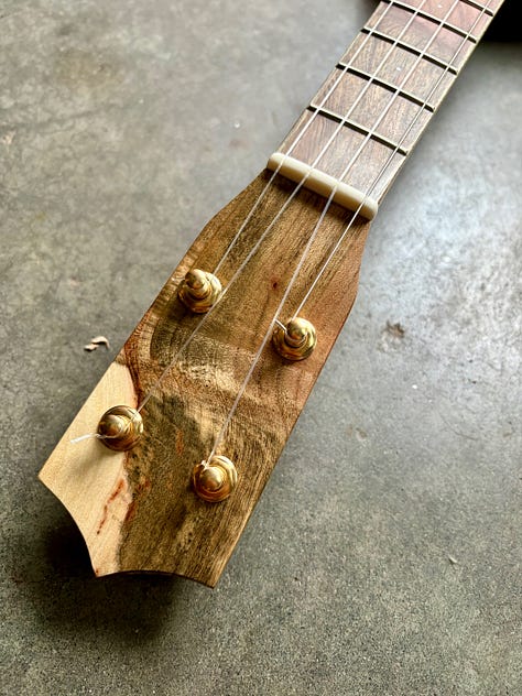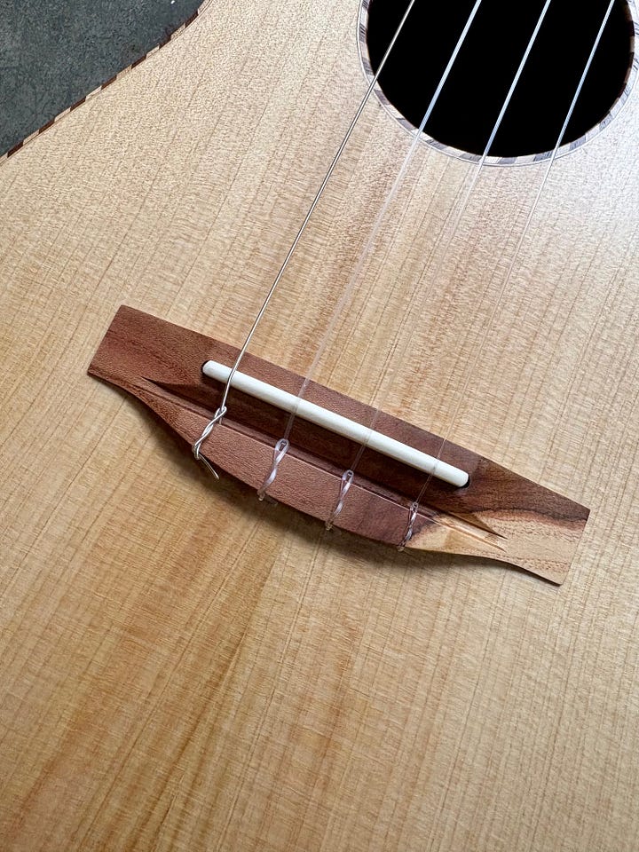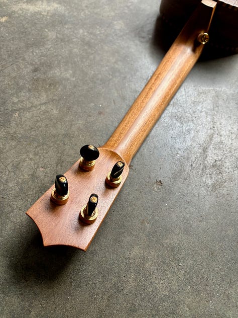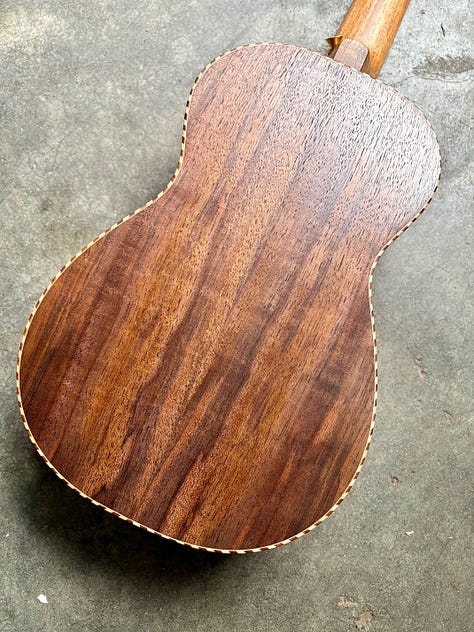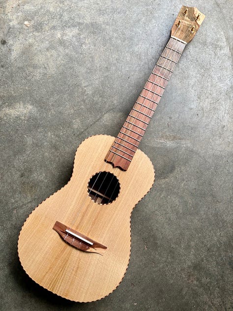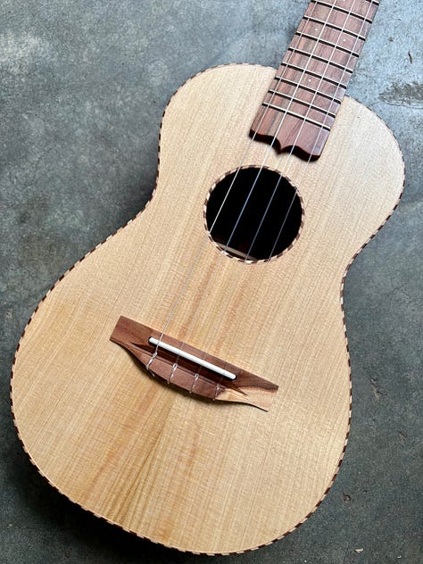 The most common “Cedar” for instrument making is Western Red Cedar. On the west coast, we also have various other “Cedars” that are also good, including Port Orford Cedar, Monterrey Cypress and Alaskan Yellow Cedar. All three of the related yellow woods sound about the same: bright, vibrant and detailed. I like this top because of the blue streaks that are in it. It’s from a stump my friend Ben dropped off, milled from a tree on the Washington side of the Columbia river. The Walnut is some rich, colorful stuff that I milled from a Hood River tree. I topped it off with some Pistachio from California orchards and shop made rope binding. Thanks Pat!