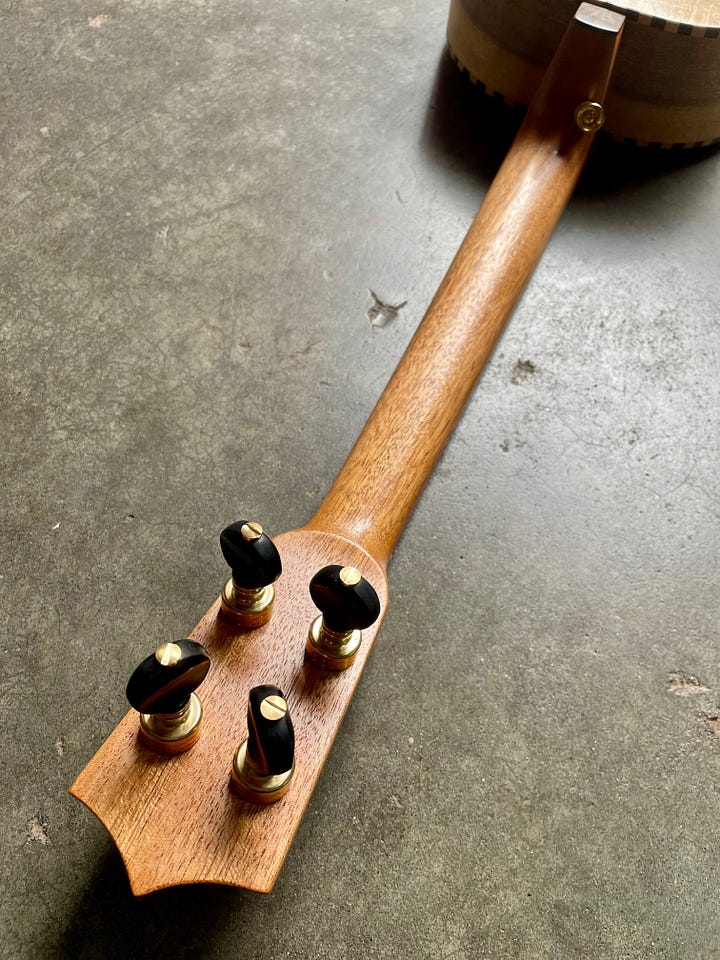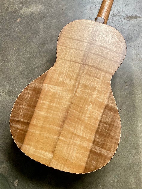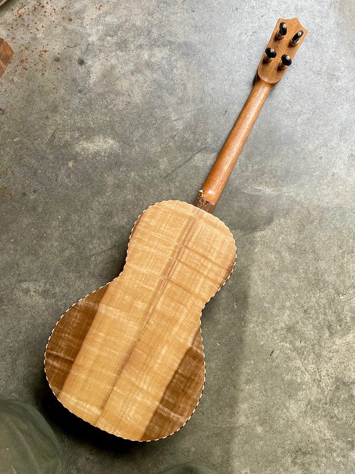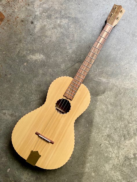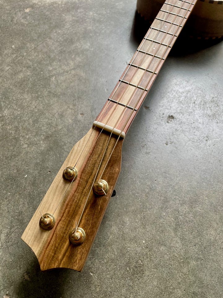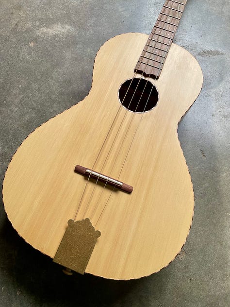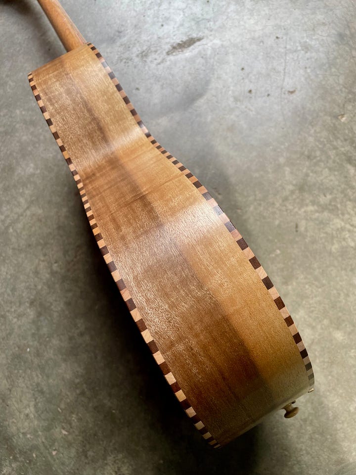 I think I have made a dozen or so of this design and I am really settling into it. I have been trying to lean in on what makes my instruments unique instead of following others and I think it pays off. This design in particular uses a flat top, floating bridge and tailpiece. A bit strange for a tenor guitar, but normal for banjo and mandolin. I settled on this feature after studying the old Regal tenor guitars, but have worked hard to tweak it to suit modern tastes and my experience. For instance, this customer asked for GDAE, which is lower pitch and higher tension than the original was meant for. I compensate for this with a truss rod in the neck and better bracing and it pays off. All of the wood for this instrument, except for the salvaged Mahogany neck, comes from woodfromthewest.com. I believe that the yellow Cedar top is made of orphan slices from when Kevin cut a batch for a big guitar maker. (I’ll take those scraps, any day.) The mix of punch brightness and rich sustain with this top is a winner. The back and sides are curly Myrtle, the fretboard/headplate is Pistachio from California orchards and the shop made binding is Maple and Walnut.