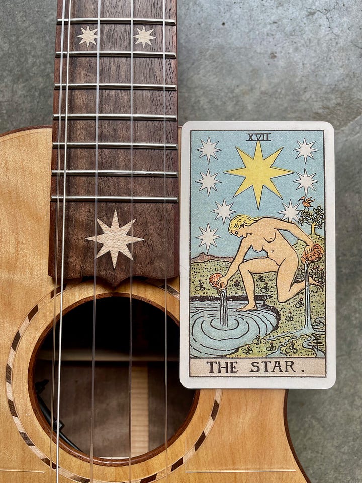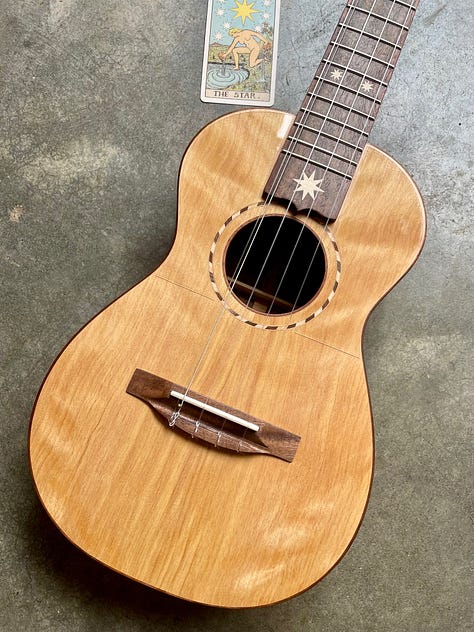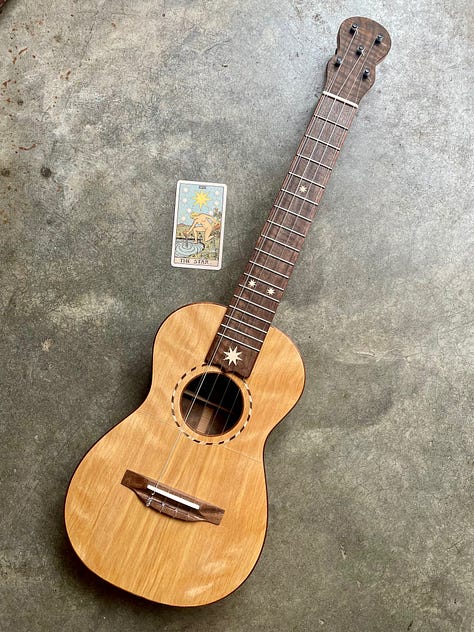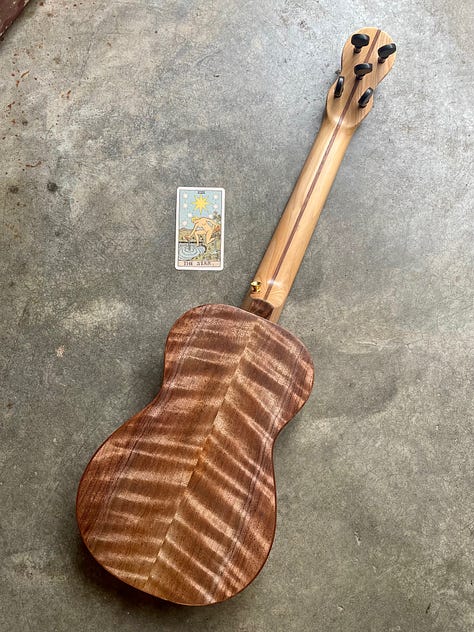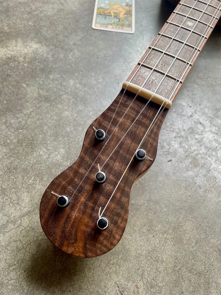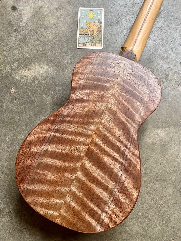 This instrument is for Jeremy, who has #333 and #666 and now #999. It has some unusual features that I am excited to show you. It is a five string ukulele, with a high and low g in a single course. That makes it play like a regular uke, but you get the high g and low g sound. To accommodate this, I used the old headstock shape I got from a Dias instrument in the Bishop Museum. This led to using Peghed brand geared tuners to complete the old fashioned look. When I do this, I can also curve the back of the headstock, like many of the original Madeiran makers did. At the bridge, the doubled strings are held in place with a little brass pin and some shallow slots in the bridge. I saw this detail on some old taro patch ukuleles. Jeremy likes to have clear plastic pick guards on the top, which are barely noticeable unless you are up close. It has a K&K pickup, ready for the stage. For the decorative details, I made a large rope rosette and matching engraft. This compliments the star inlays in the fretboard, which came from the classic tarot card drawn by Pamela Coleman Smith in 1909. The curly top, back, sides, fretboard and headplate all come from Oregon, courtesy of woodfromthewest.com. Thanks for your continued support, Jeremy!