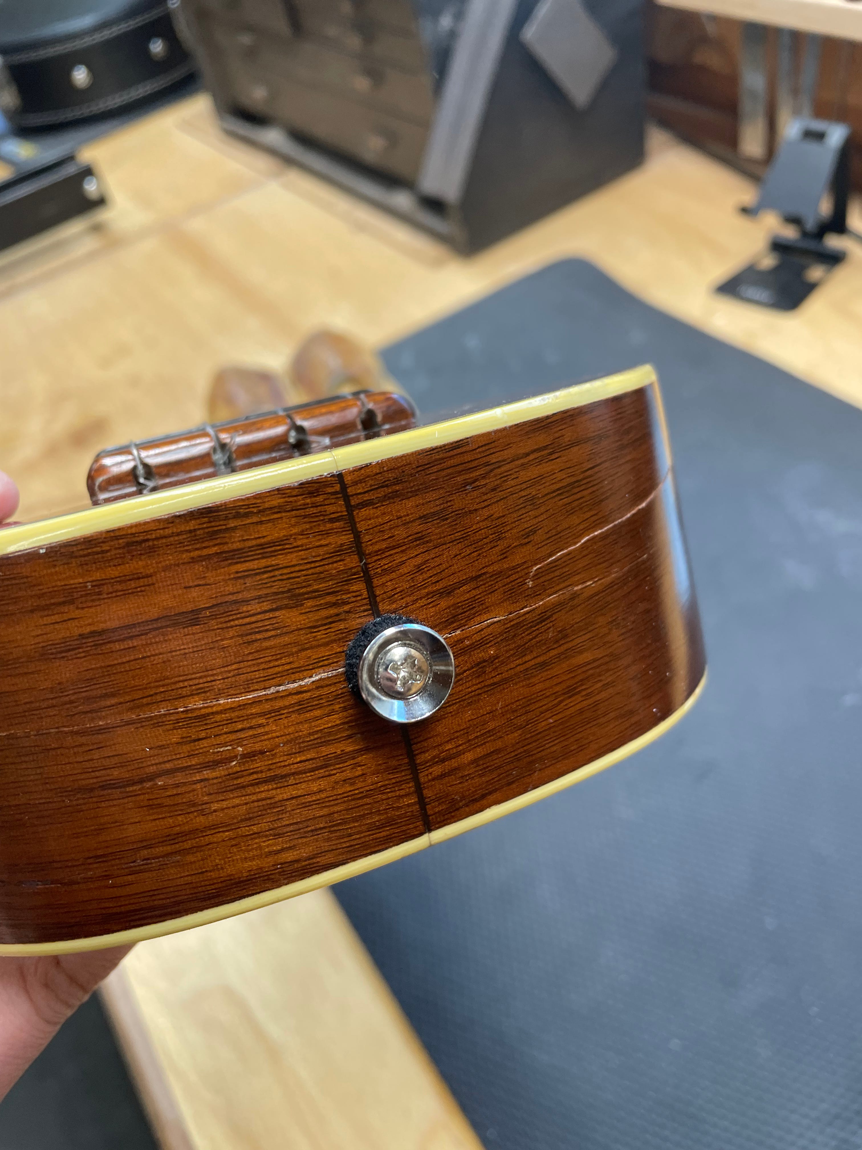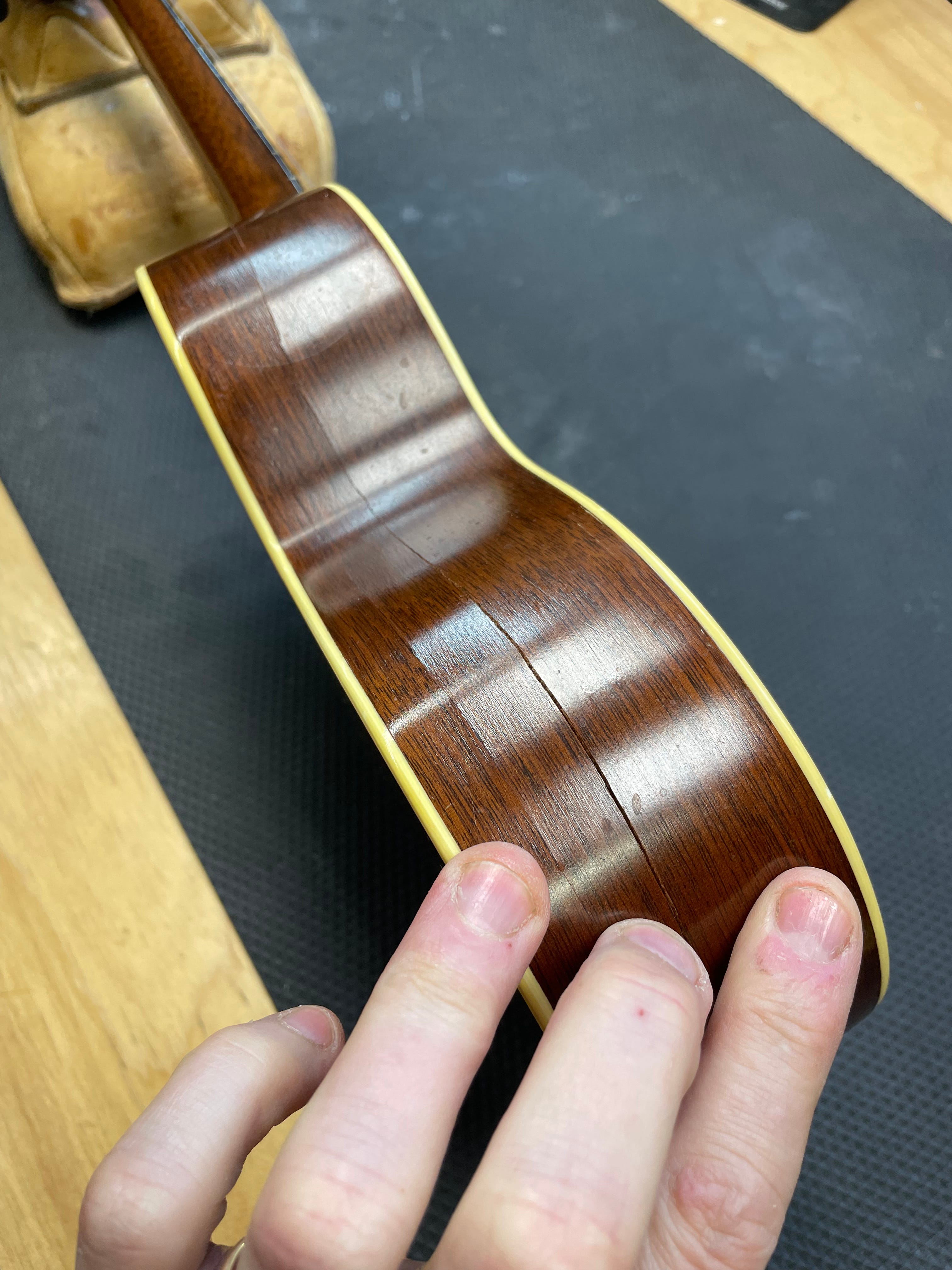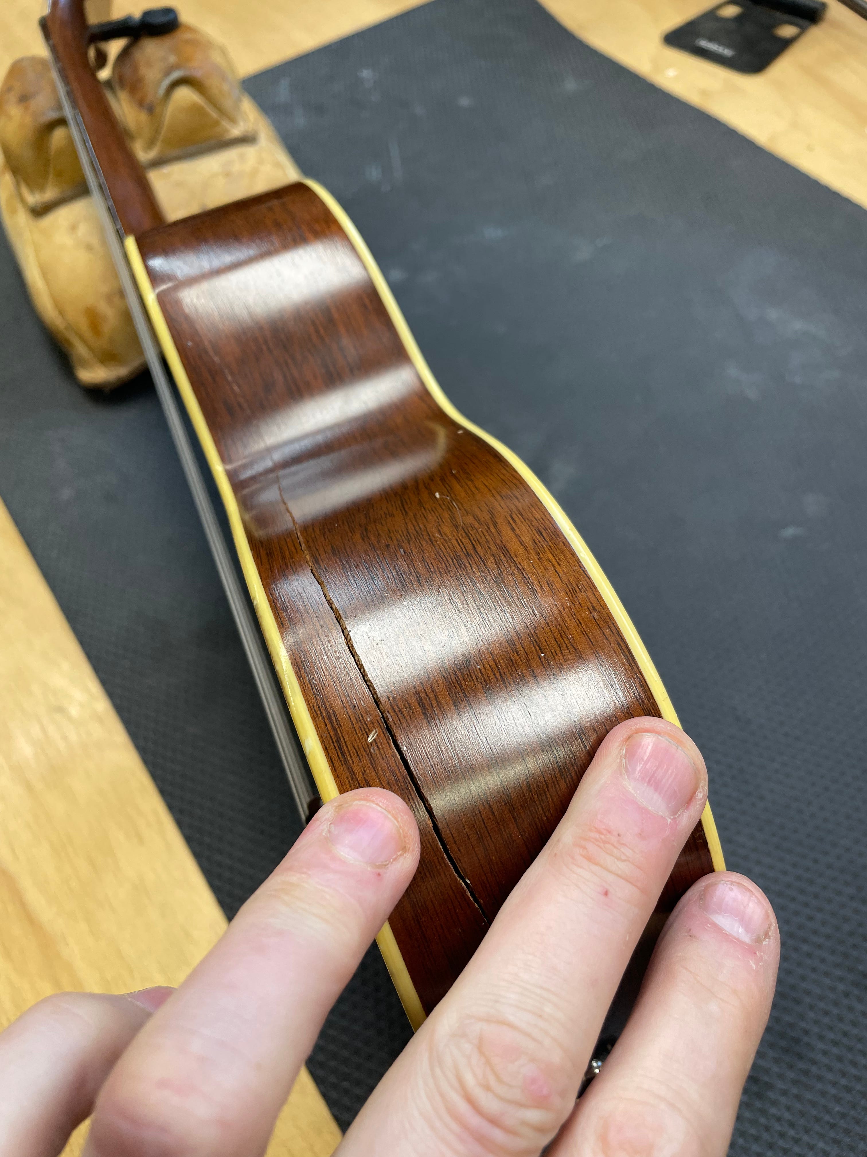 The damage happened when Piper dropped the uke. It hit the strap button, cracking the sides all around. No wood was lost, so the cracks should line up pretty well. I will use hide glue for the repair, likely adding a few small cleats inside to hold the sides together. I will aim for good alignment, but if a little bit of the sides do not fully align, we do not plan on scraping, sanding and refinishing the sides to make them “perfect.”