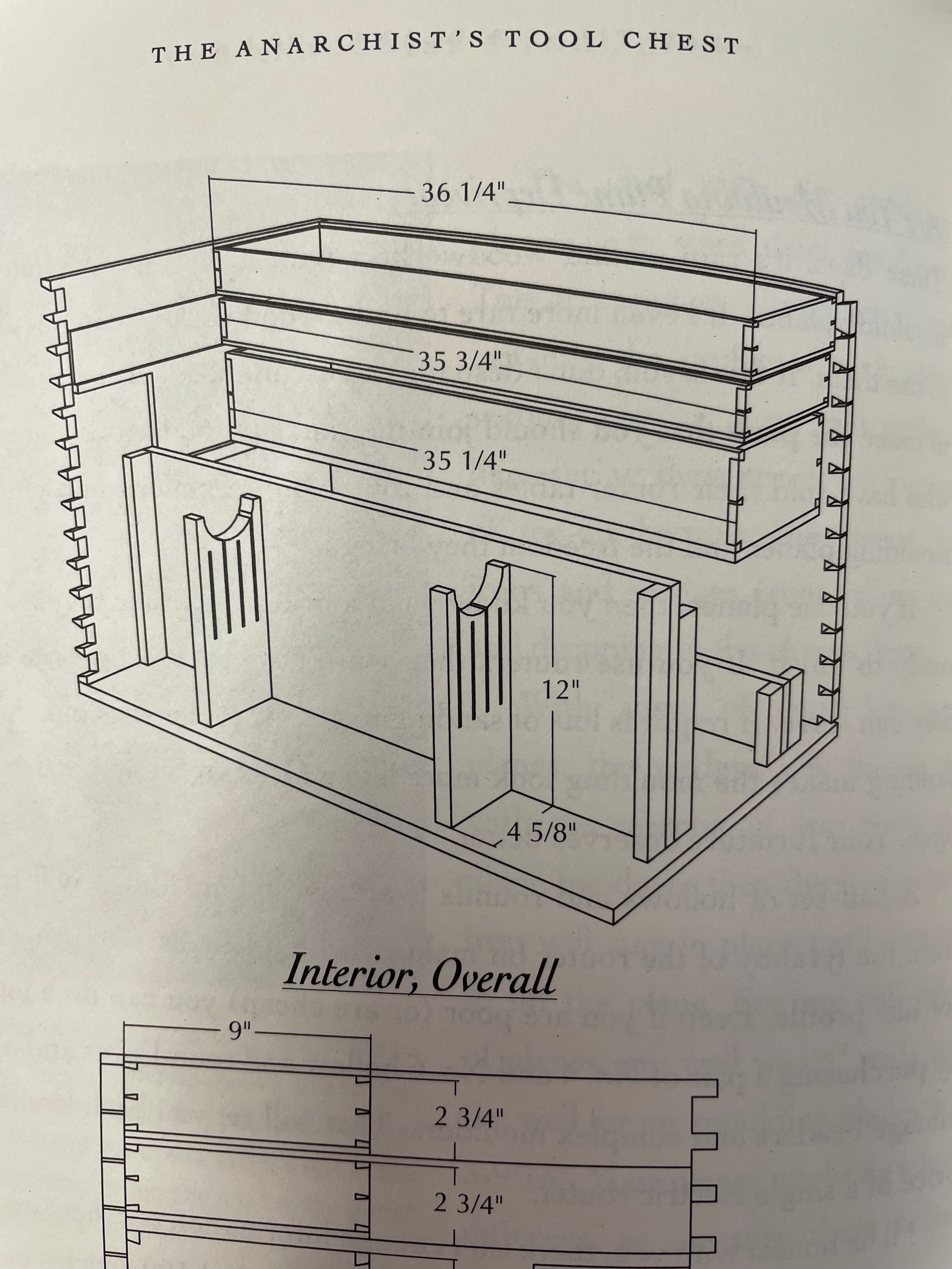 In pre-industrial times, up until mid 20th century, it was common for woodworkers to keep all of their tools in one chest. Their tools were often labeled with their name and the chest was locked at night. When they needed to leave a job, they could heave the chest onto their transport of choice and move on to the next opportunity. It was a physical manifestation of their skill and contained most of what they needed to make a living. I first encountered a chest like this in the book Carpentry for Beginners by Charles H. Hayward. (Btw, this title is so misleading that it could make me cry. I have been humbled many times by what Hayward thought “beginners” should be capable of.) Here is the chest he suggests for an early 20th century amateur woodworker.