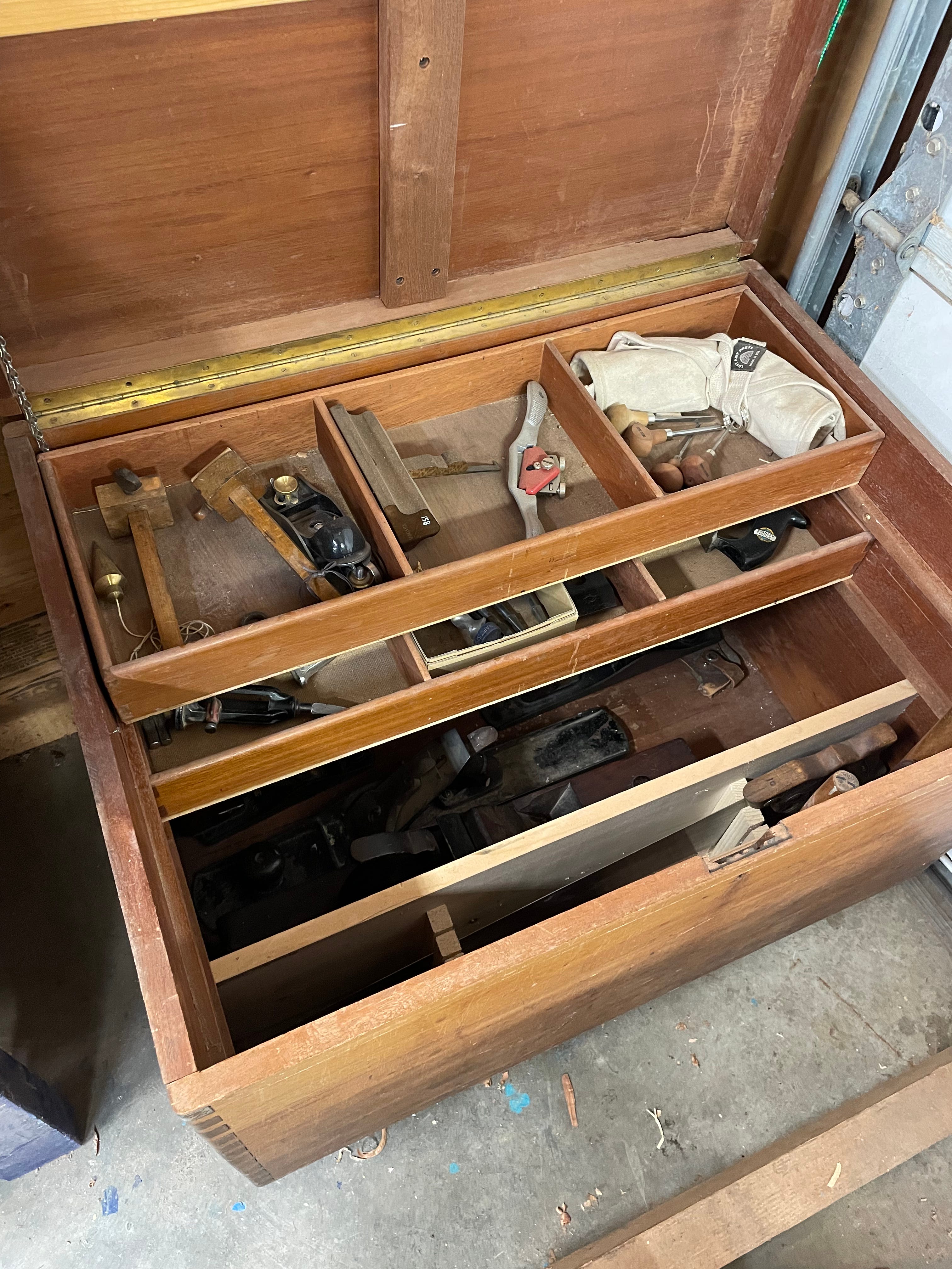 As a test, I could fit my largest crosscut and rip saws in our chest, as well as my longest plane, something that would be hard to do in the Hayward chest. Even though it wouldn’t swallow as many tools as Schwarz’ chest, our chest would be much easier to move.