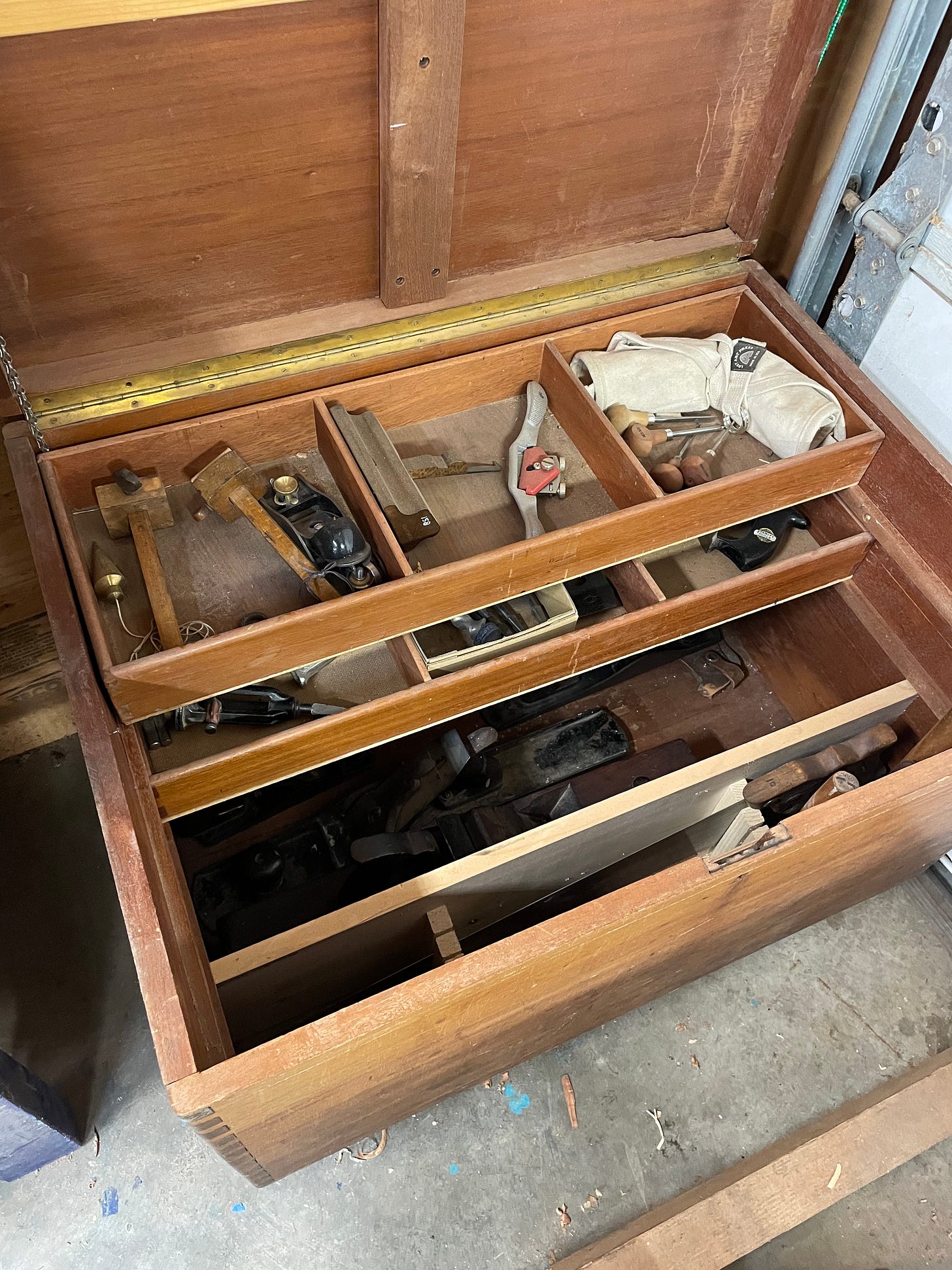 As we were driving back from music camp last week, we passed a local lumber mill that had a fire last year. Near the road they have a spot where they put free stuff, trash and scrap wood as they clean out and rebuild. Even while driving, I easily noticed a familiar shape among the trash: a tool chest. I pulled in by the pile to find it soaking wet and full of trash (mainly Dutch Bros cups). It was big enough to house a solid kit of joiner’s tools, but small enough that I could pick it up on my own. I noticed the dovetailed corners, bold skirt boards and the initials painted on the front. I threw it in the back of the truck and went home to unload from camp. I don’t NEED a chest, but I couldn’t help but be swept up in the history and tradition of a chest like this. Who made it? What was their craft? Who did it get passed down to? Why is it in the trash?