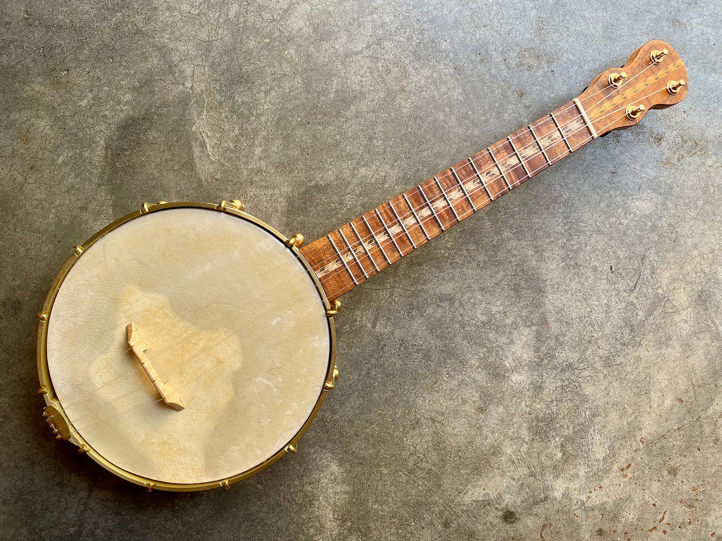 I normally just play an instrument until someone wants to buy it. I had my last banjo ukulele for 3 years and it sold this spring. For my next one, I wanted something really old timey, something that referenced the instruments from 100 years ago, but had modern playability. I started with a thin, laminated Maple rim and added a Koa veneer and some rope binding to it. I made the neck out of Maple, with a Koa fretboard/headplate with a herringbone stripe down the middle. I finished it in amber shellac, added a goat skin head and a K&K pickup, just in time for the first gig of the summer! It is lightweight, cheerful and loud!!!!