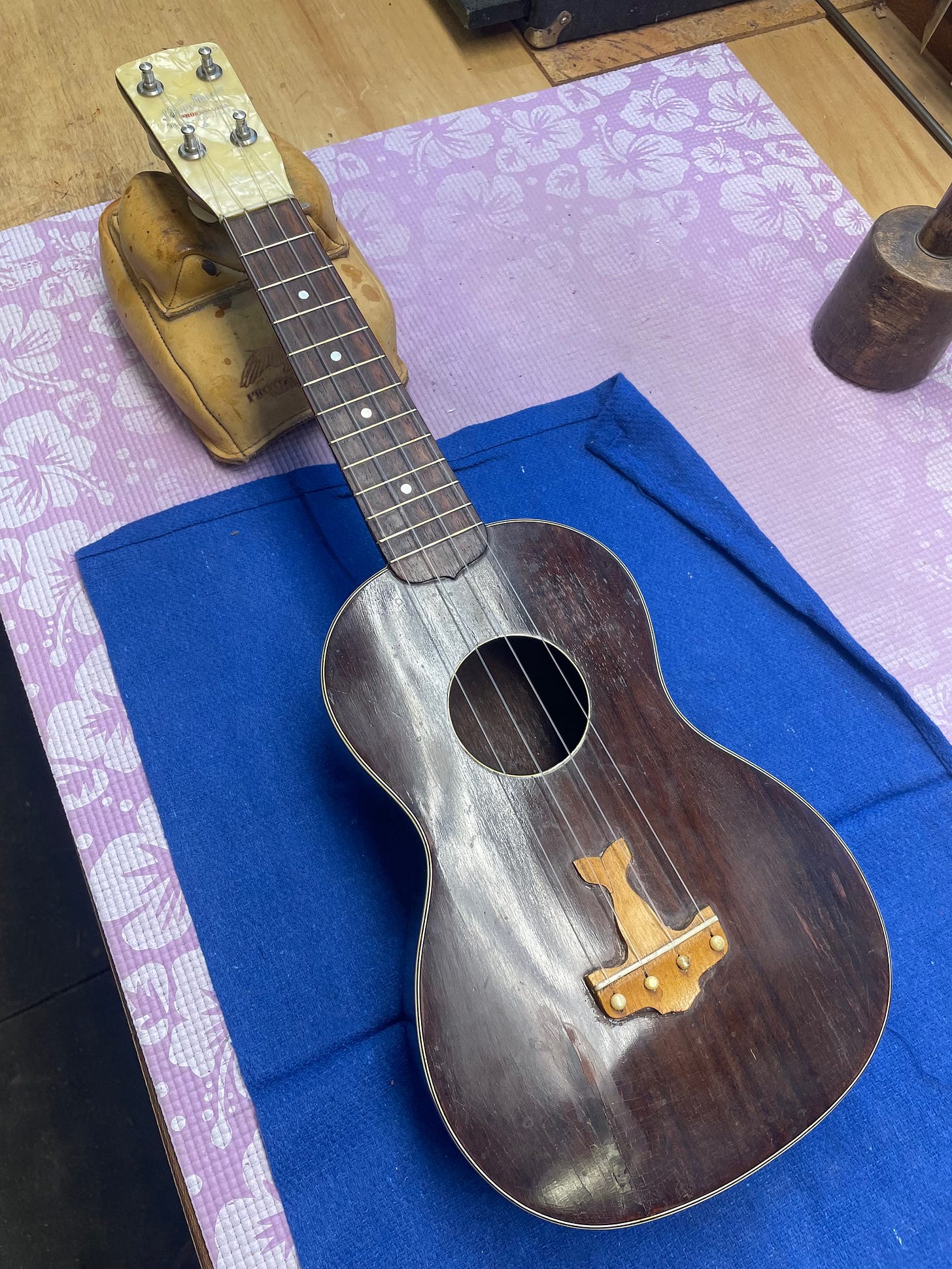 The Marvin uke is very lightly built, has many cracks and is missing two braces. The neck is already set at a good angle and it will be easy to play. Because it is a collectable, high quality antique, I will use only the proper glue, finish, materials and techniques to get it back in shape. The customer has many instruments, so I know he isn’t missing out on strumming while I have this. He also has a backlog of ukes waiting for me to fix.