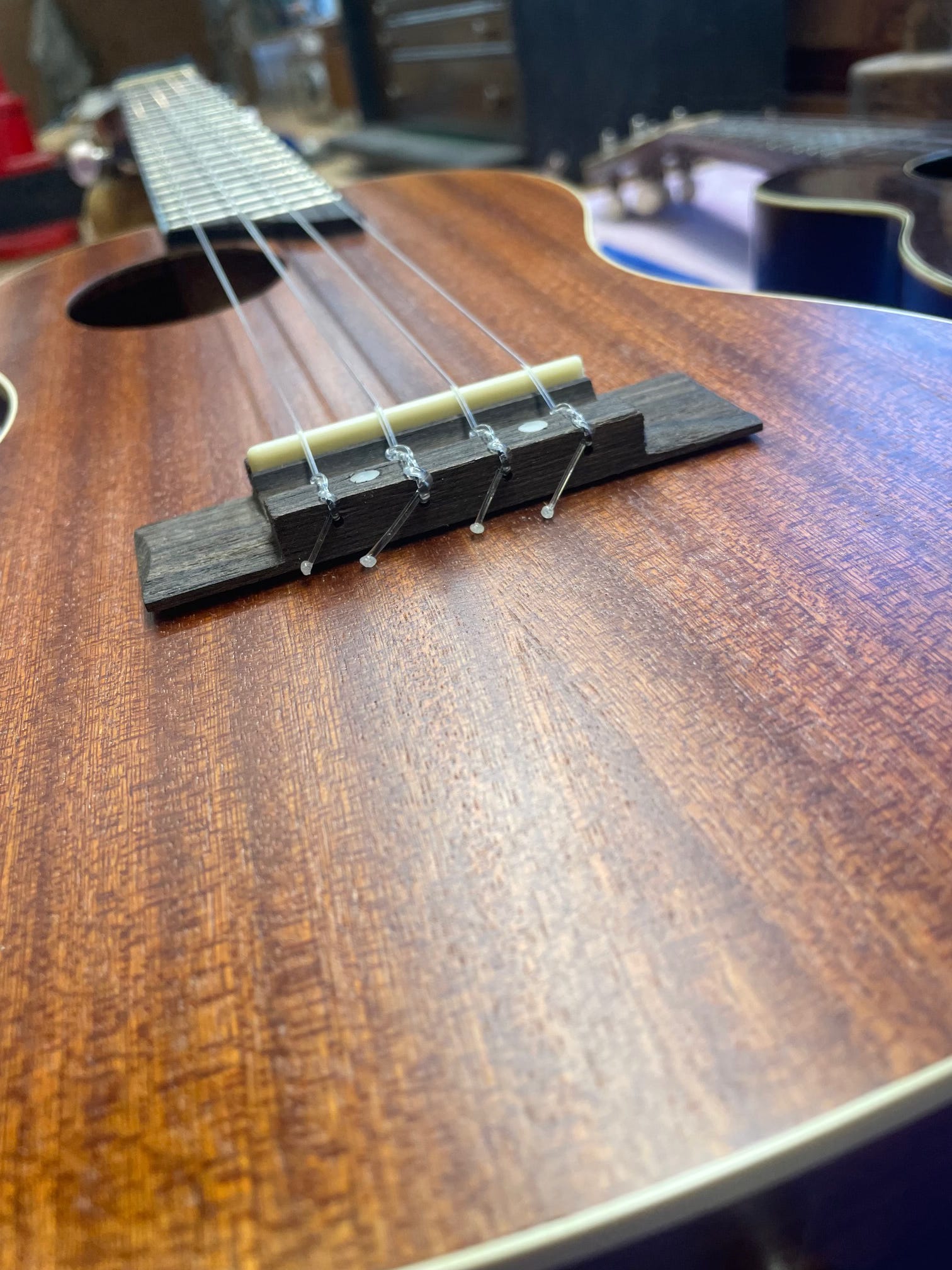 Customer #1- A new ukulele student, signed up for Nicole’s class, came to the shop to get strap buttons for her uke, pick up the instructional book and get a mini lesson from Nicole. I usually give the uke a quick once over, add the buttons and leave the uke alone, especially if it is good enough for a beginner. In this case, she had two, one was a Kala soprano that was fine, but she really preferred the size of her tenor. It is an un-branded Chinese made tenor of Sapele wood. It was fine, except the bridge was about to fall off. In fact, the two screws under the pearl dots on the bridge are the only thing keeping it together. I spoke up, pointing it out and asking if she wanted me to fix it. In a case like this, I am not really fishing for repair work, especially on a uke of this quality level, but I want to help her out and make sure she is ready for class in January. I thought I could get the bridge glued down and put new strings on it quickly and at a budget price.