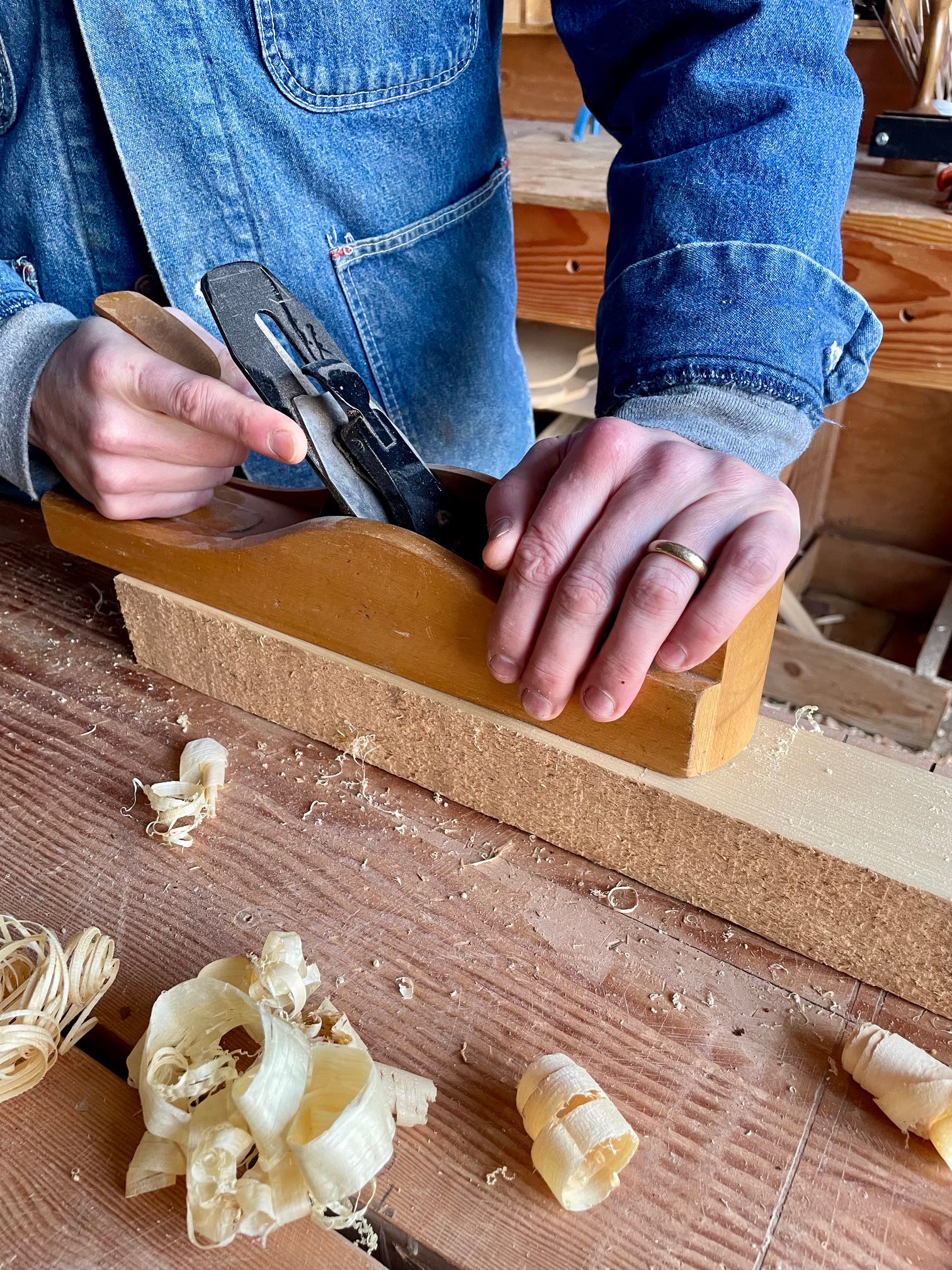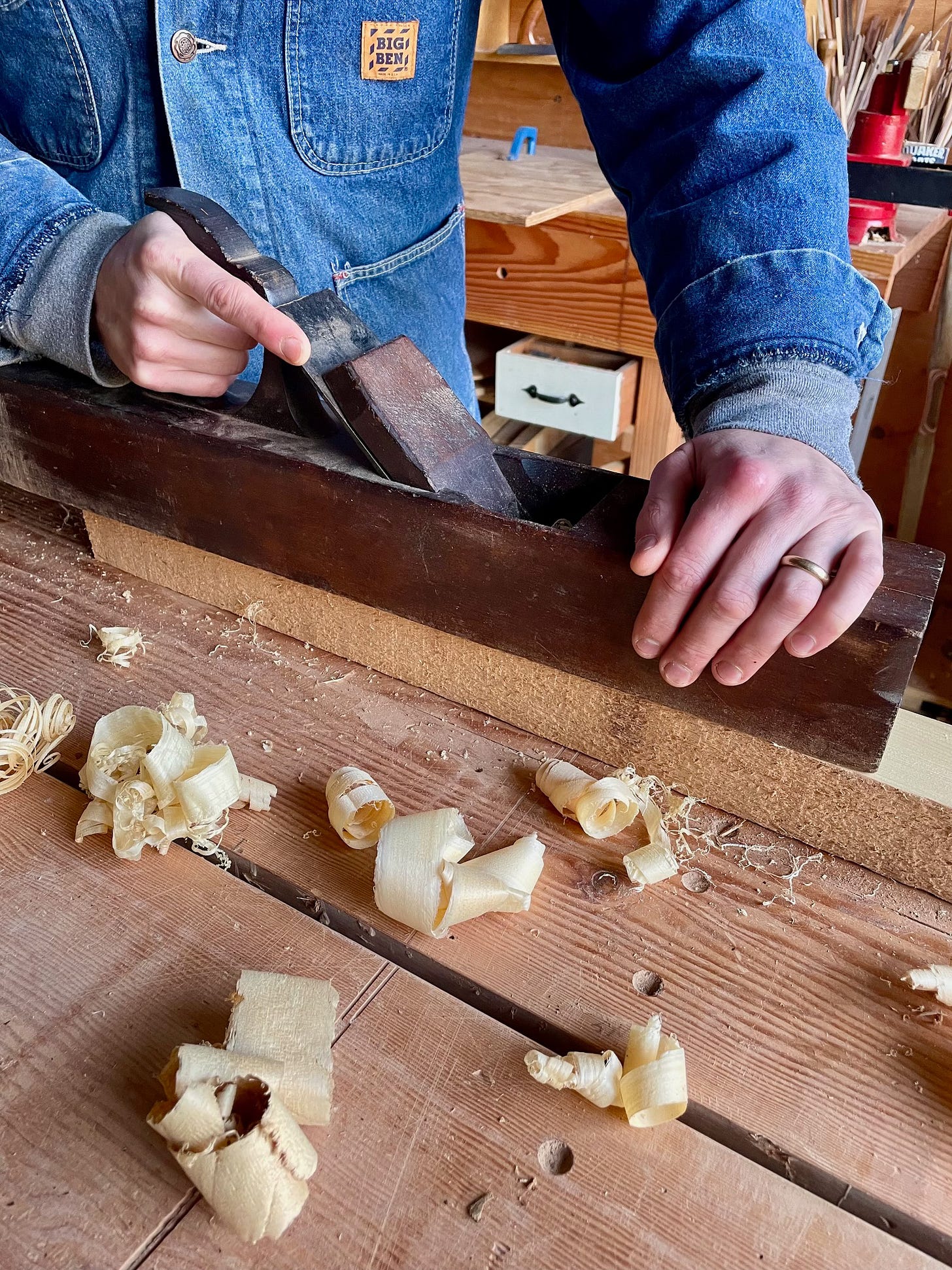 My 22-inch jointer plane, for example, weighs a full pound less than my Stanley No. 7. While wooden-bodied planes require some practice to adjust, generations of skilled woodworkers managed this with nothing more than a small hammer. The basic grip involves a pistol grip with the right hand, while the left hand either grips the body overhand or lightly rides along the top or left edge. Ergonomically, the most common complaint is the large, blocky shape. Over time, however, I have learned to minimize thumb engagement—my most painful joint—by allowing the weight of my left arm to engage the front. Despite its bulky appearance, I regularly use this plane for fine work in my lutherie shop, including jointing pieces for invisible glue joints. User tip: wooden planes work best with some speed to the stroke. Take advantage of the light weight and give it some forward motion, you might be surprised how easily they cut this way.