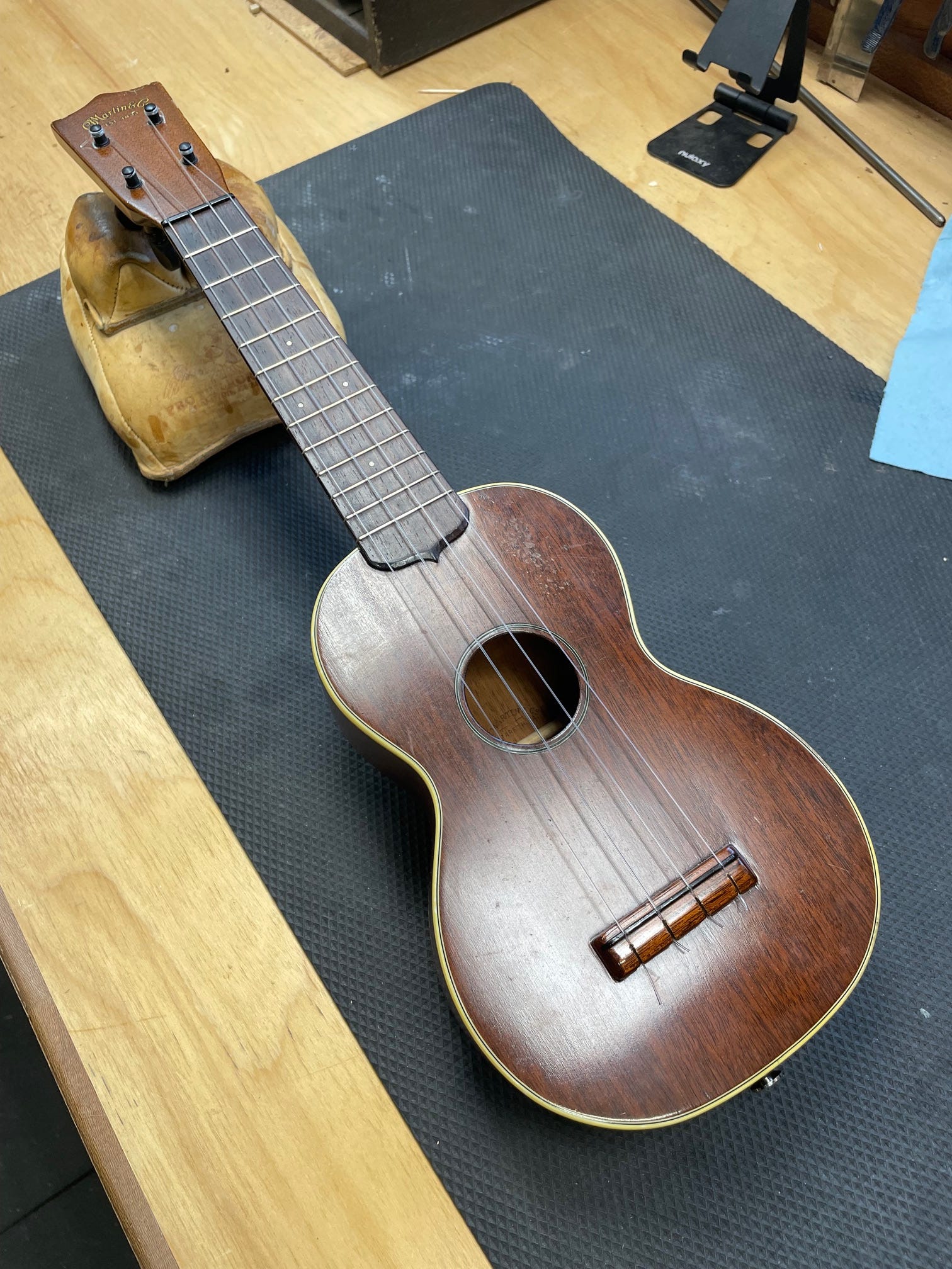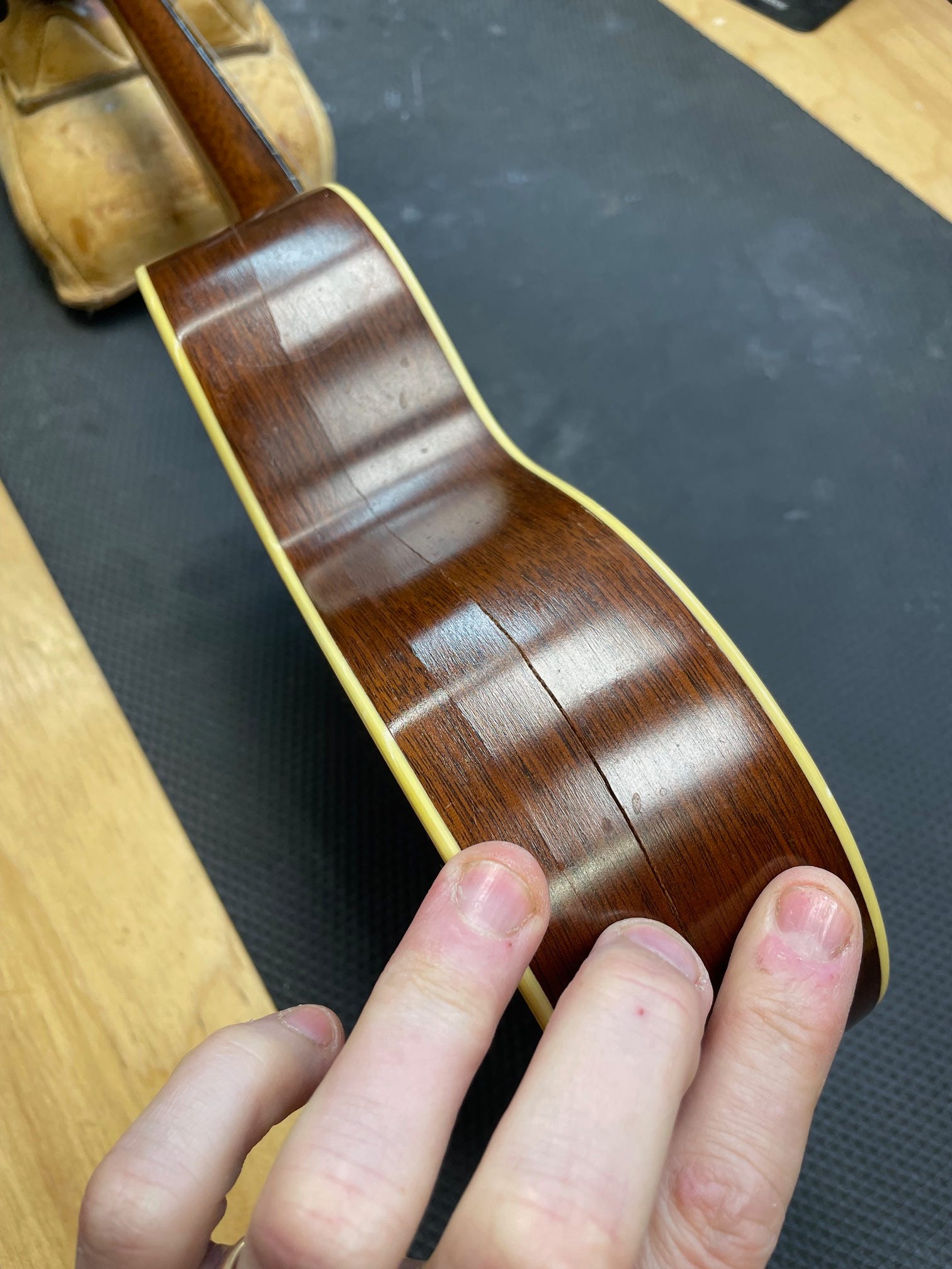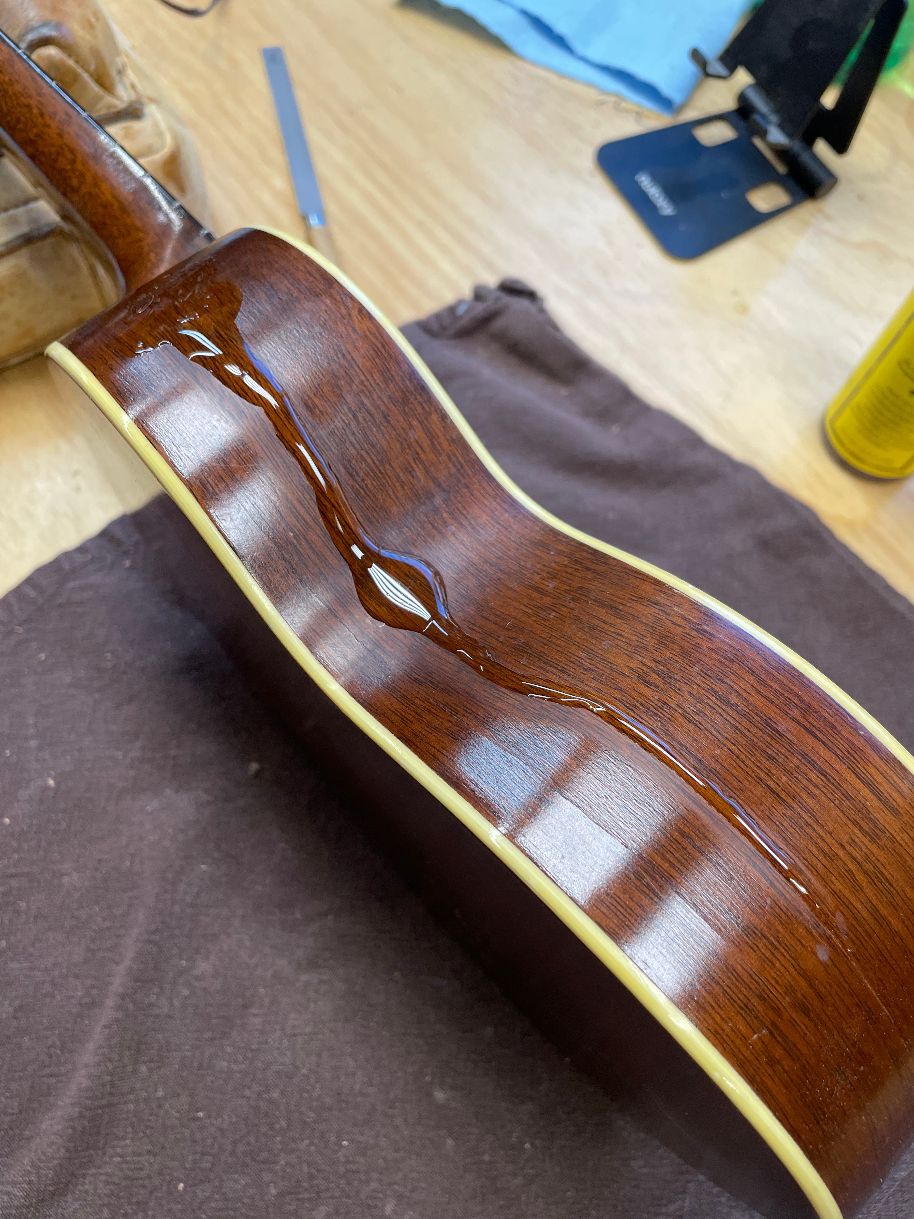 Do you remember the Martin soprano we brought home from camp last month? While at camp, it fell to the ground and landed on the strap button, causing the sides to crack. Parker and I agreed that I would glue all the cracks up carefully, but would not do a full refinish of the cracked sides. This means that in the right light you may still see some of the cracks or be able to barely trace them with your finger. The alternative would be scraping and sanding the sides and then staining and finishing to match. It would have tripled the price of the repair.