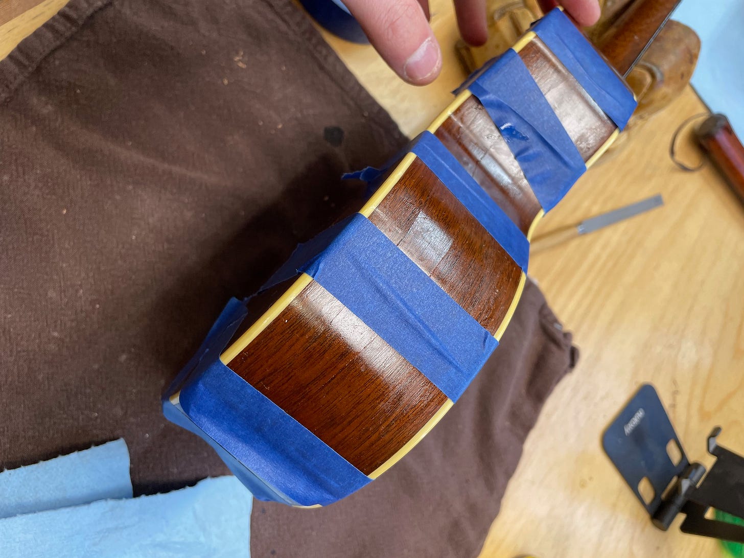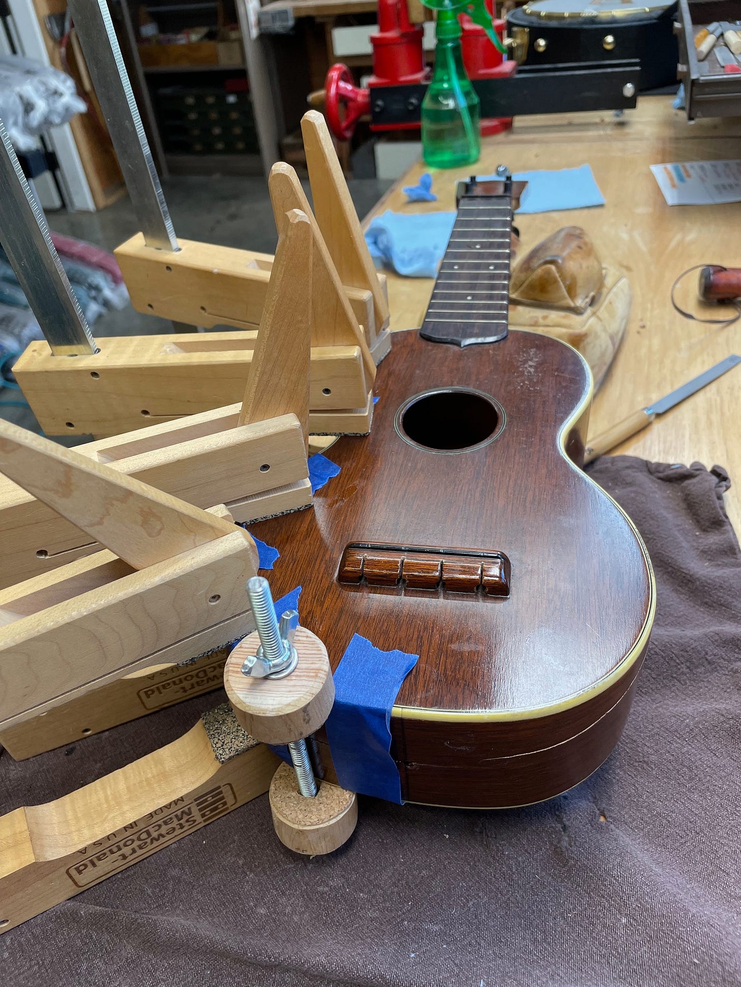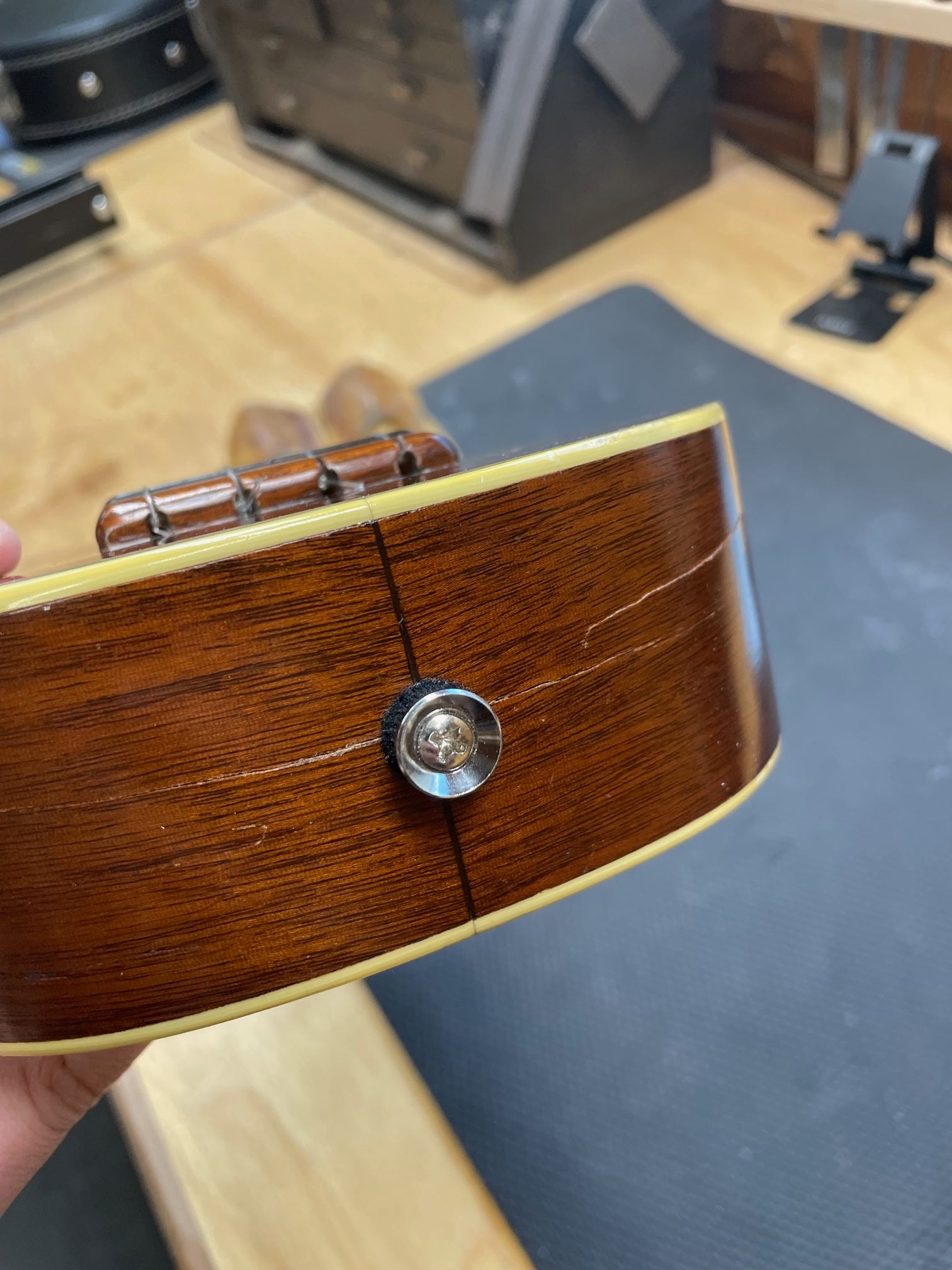 Do you remember the Martin soprano we brought home from camp last month? While at camp, it fell to the ground and landed on the strap button, causing the sides to crack. Parker and I agreed that I would glue all the cracks up carefully, but would not do a full refinish of the cracked sides. This means that in the right light you may still see some of the cracks or be able to barely trace them with your finger. The alternative would be scraping and sanding the sides and then staining and finishing to match. It would have tripled the price of the repair.