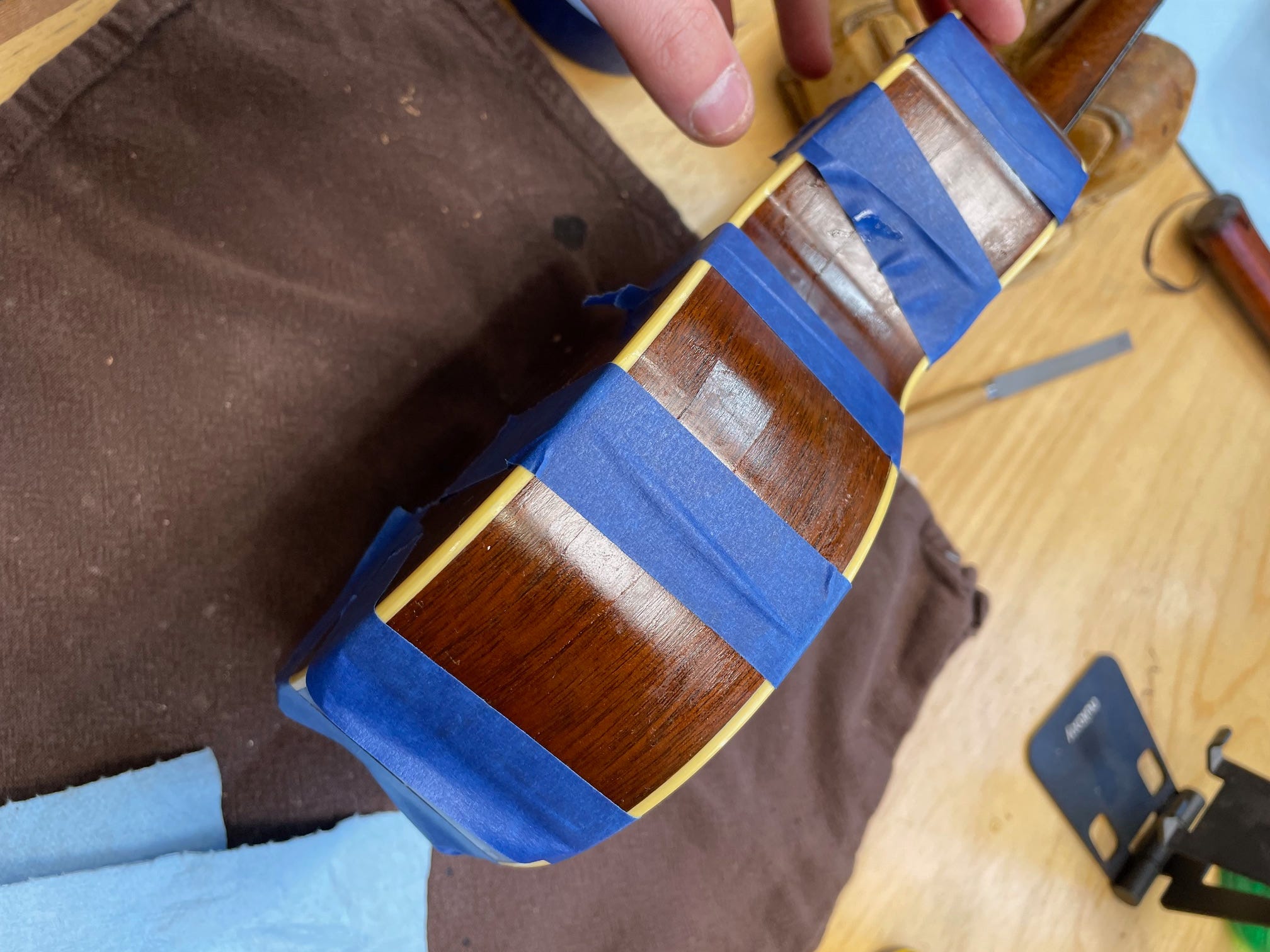 Now I will use blue tape and clamps to push it all together, cleaning up any squeeze out.