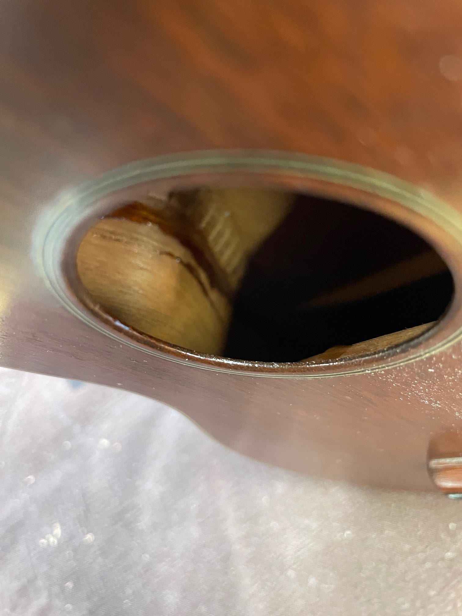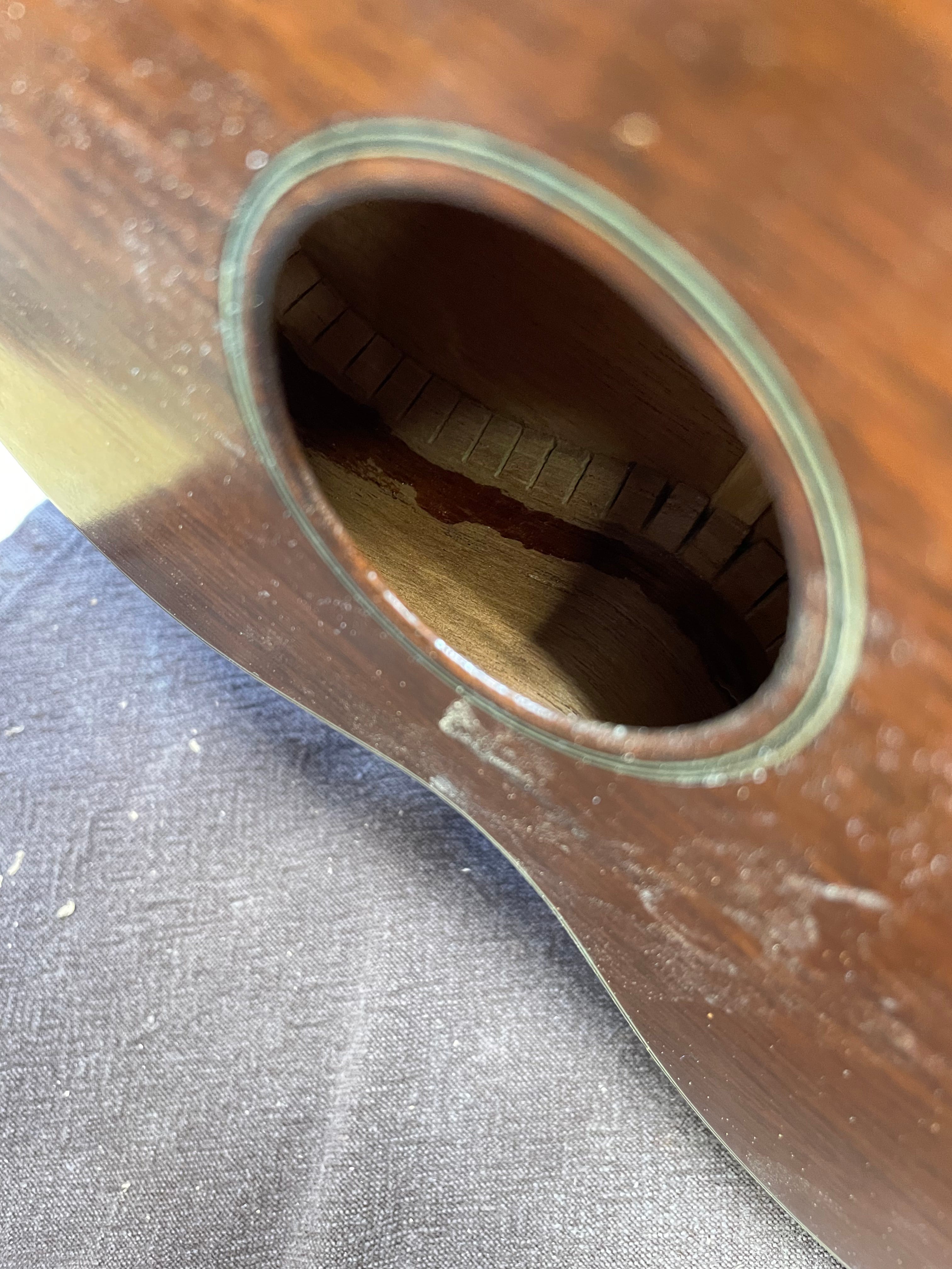 Before I got started, I looked in the sound hole and saw a lot of glue already in there. It looks like at least one of the cracks was old and had been repaired in the past. See the line of glue inside? Instead of adding wooden cleats to support the crack, they just left a thick mass of glue. Cleaning the whole thing out would be possible, but likely hours of work. I chose to leave it in there.